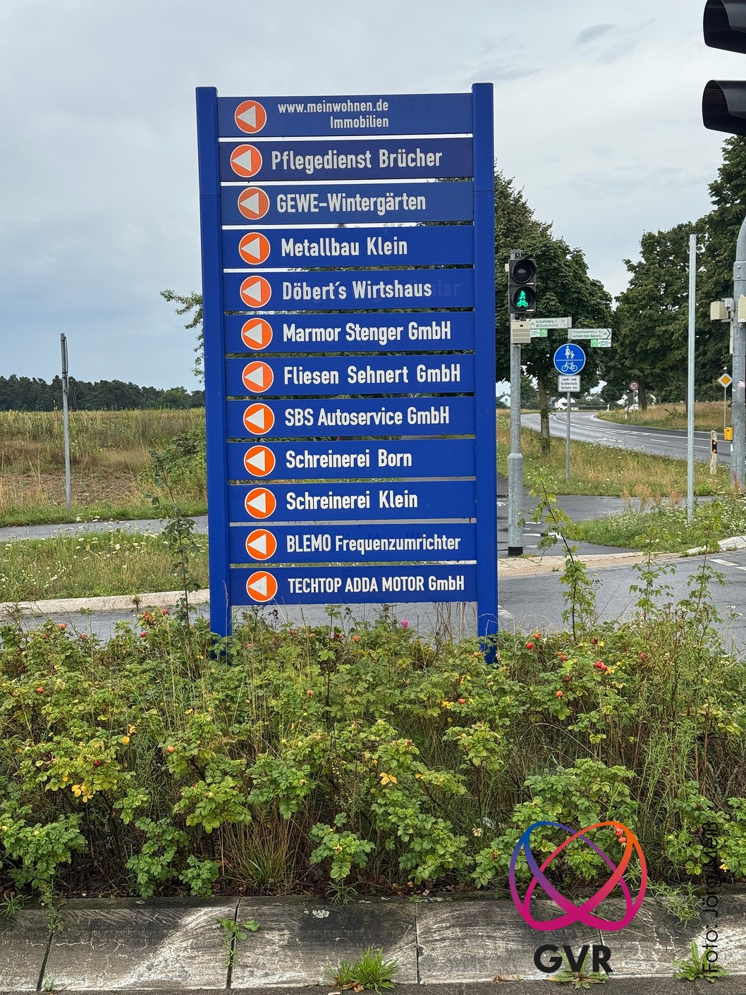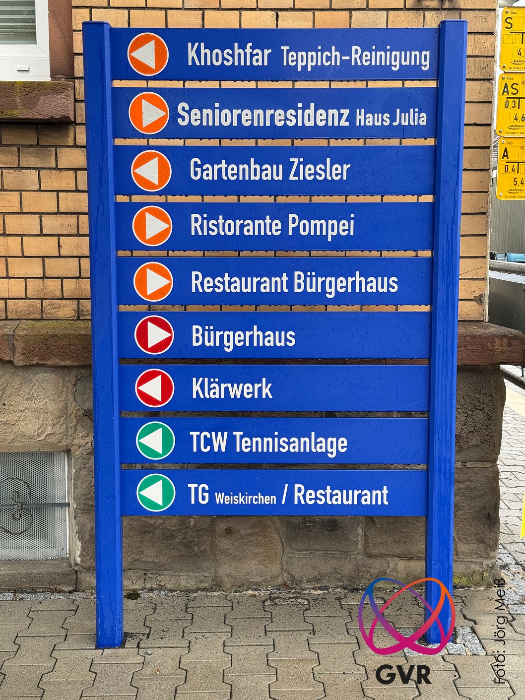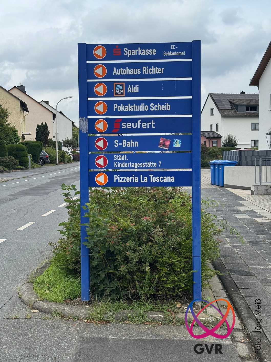 Der Gewerbeverein unterhält eine große Anzahl von blauen Hinweisschildern